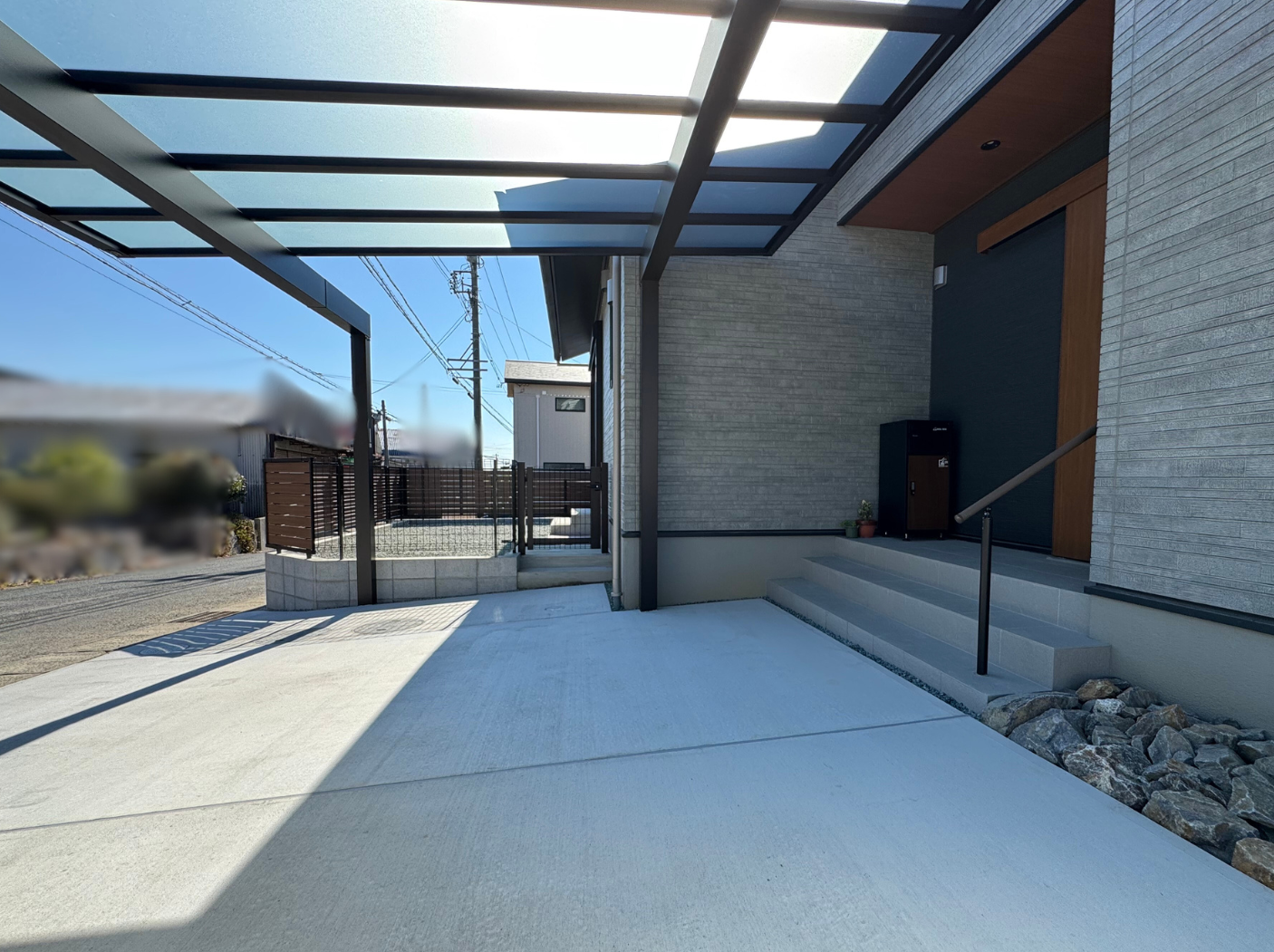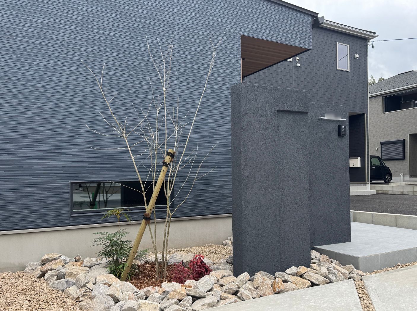 デザイン塀・タイル・カーポートの重厚感からそっと見えるマット調パネル情景。その先に見えるシンボルツリーがアクセントとなっているエクステリアです。