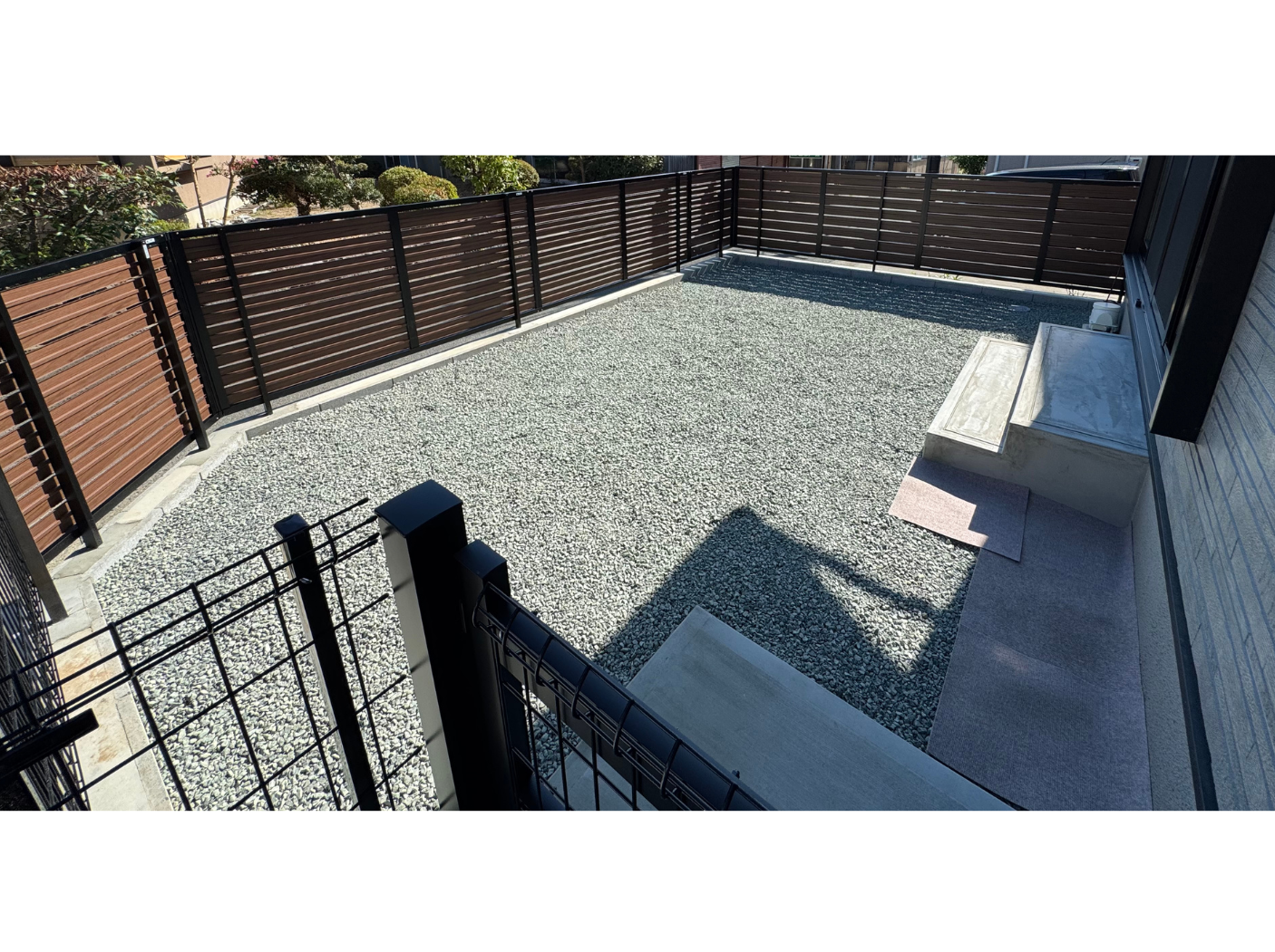 板塀で囲んだスペースは植栽・砂利・洗い出しで仕上げ、くつろぎの空間になっています。