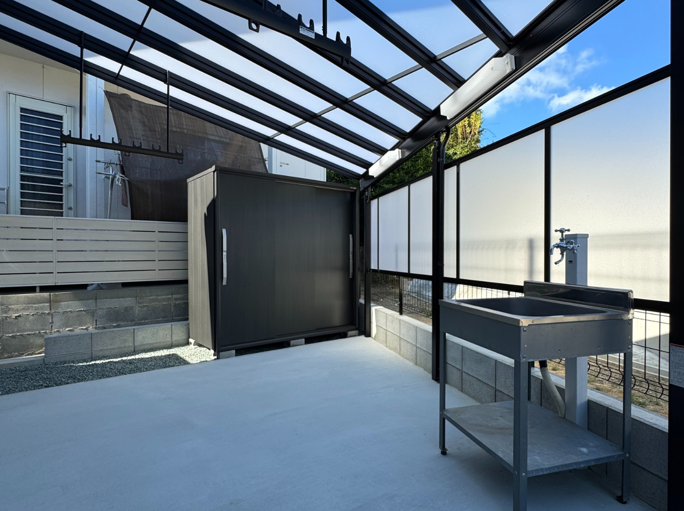テラス:LIXIL スピーネF600 台形加工(ブラック)前面パネル1段・吊下げ物干B付