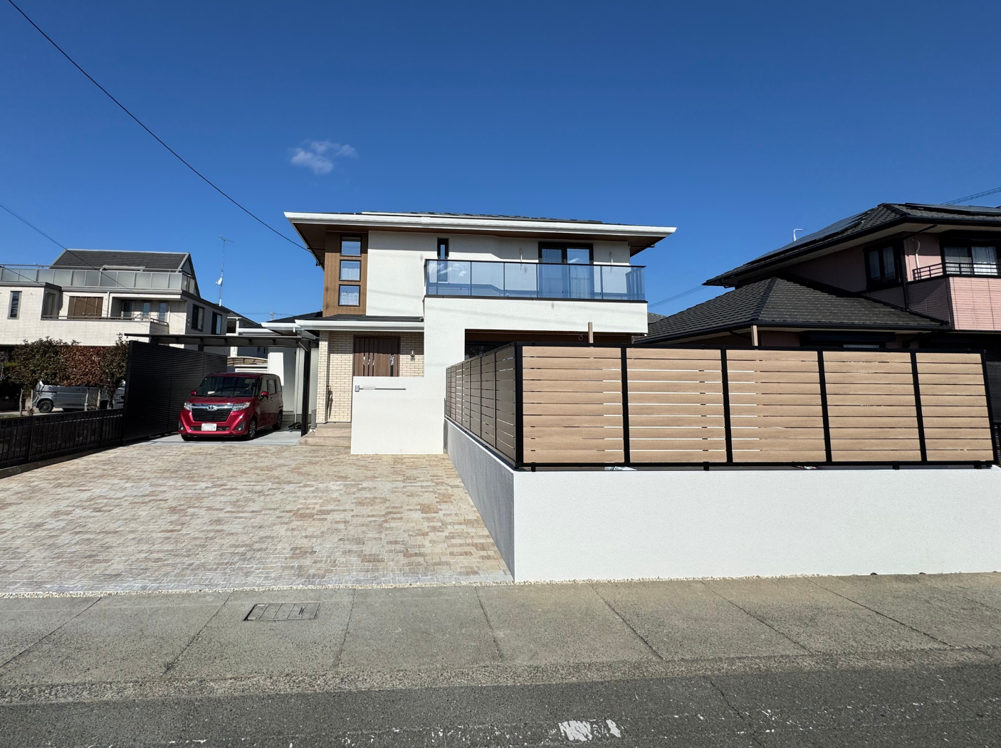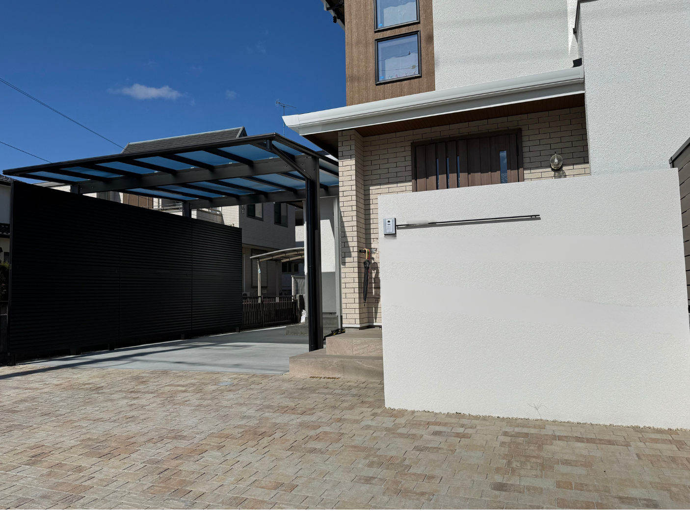 敷地の広さを活かし車を駐車するスペースを充分に確保したオープンスペースと門柱、門扉、フェンスなどで区切られたクローズスペースを組み合わせ防犯を兼ね備えたセミクローズエクステリアが完成しました。