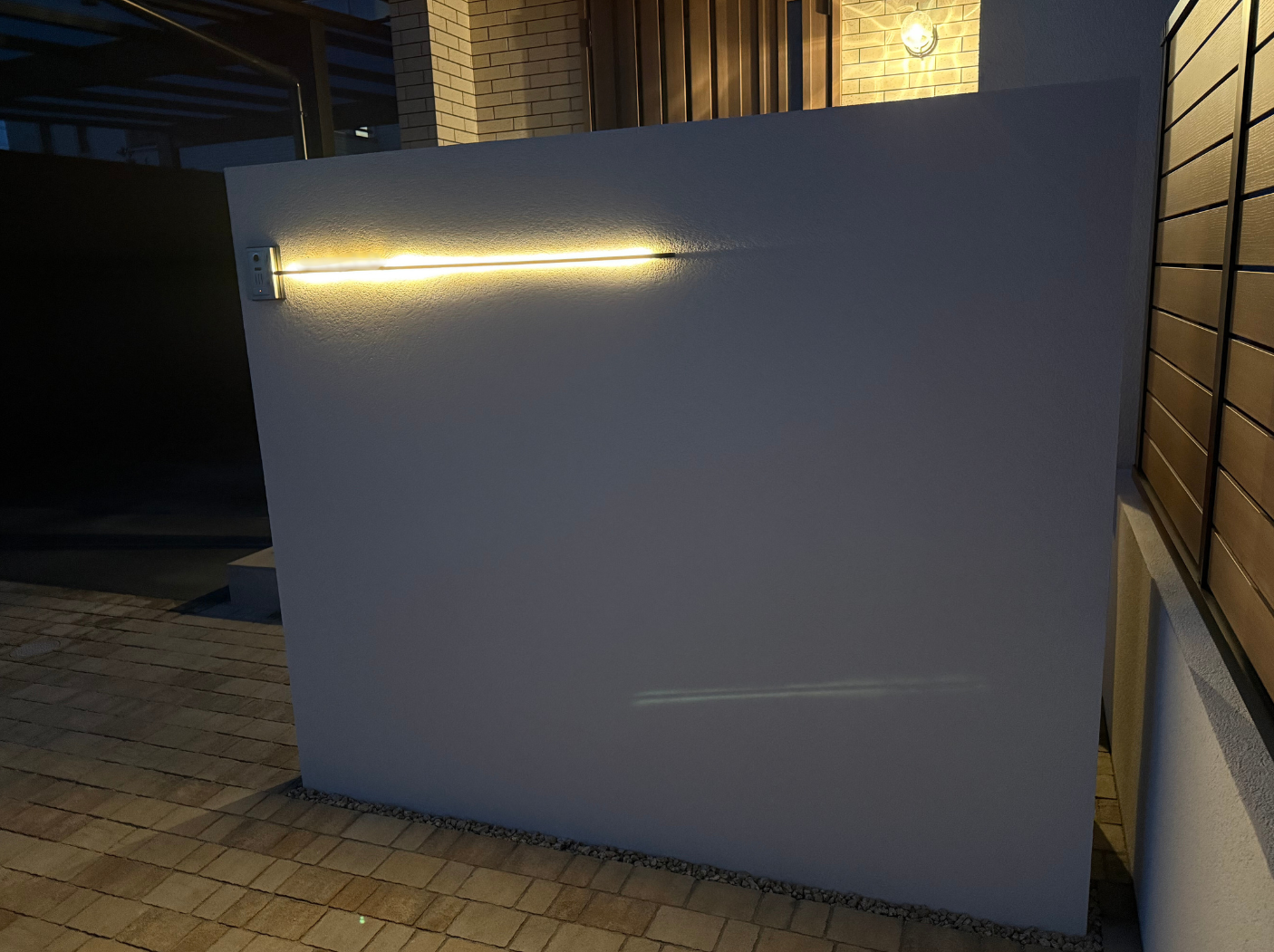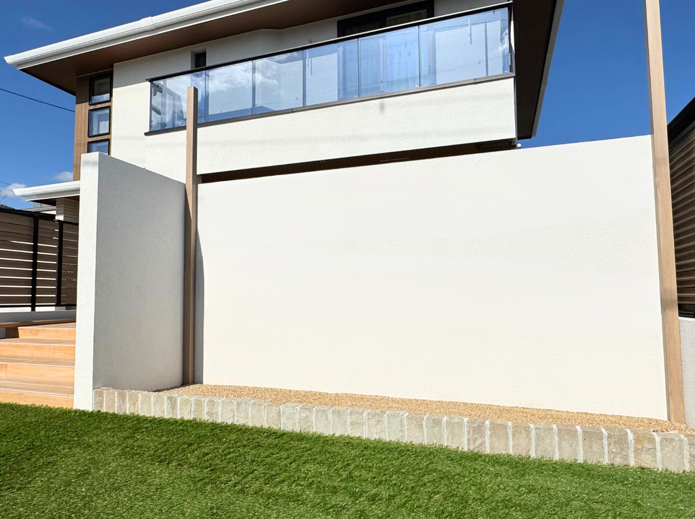 敷地と道路の境界に施した白のウォール(壁)には違う厚みのブロックでケコミを付け立体感を出しスリットを入れる事で圧迫感を軽減しています。