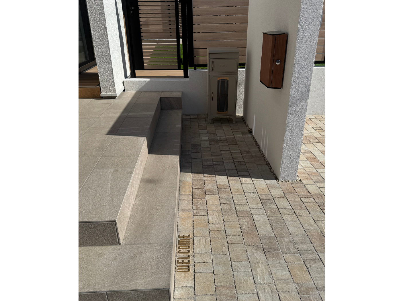 アプローチを暖色でまとめ、門扉からのぞく自然石の階段がナチュラル感を出し、やさしい印象となりました。