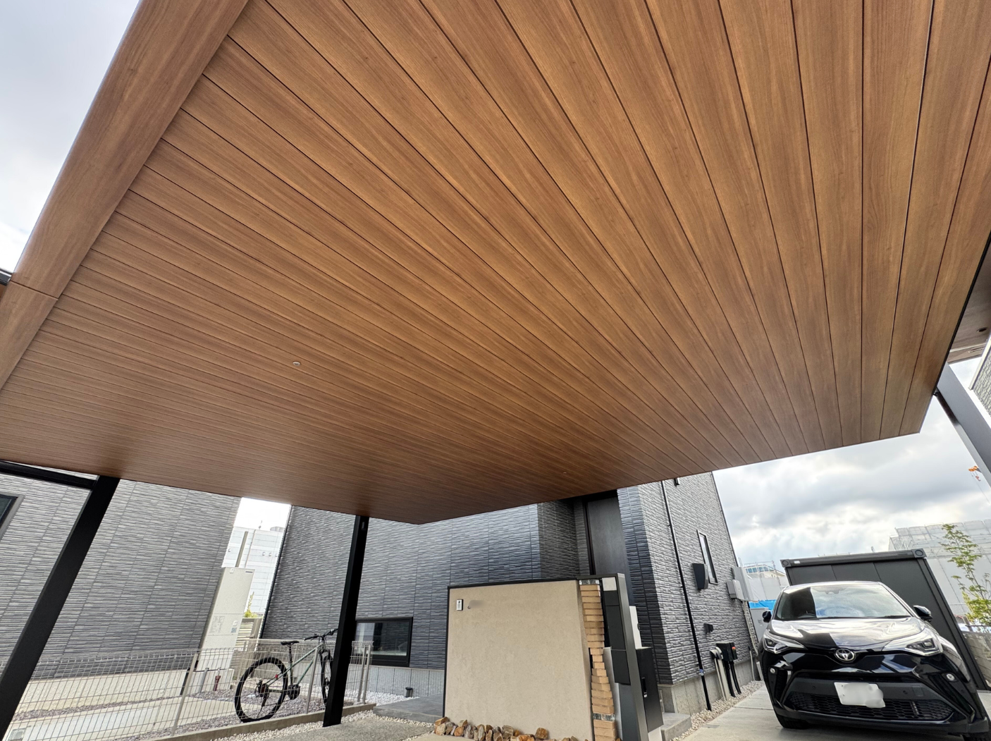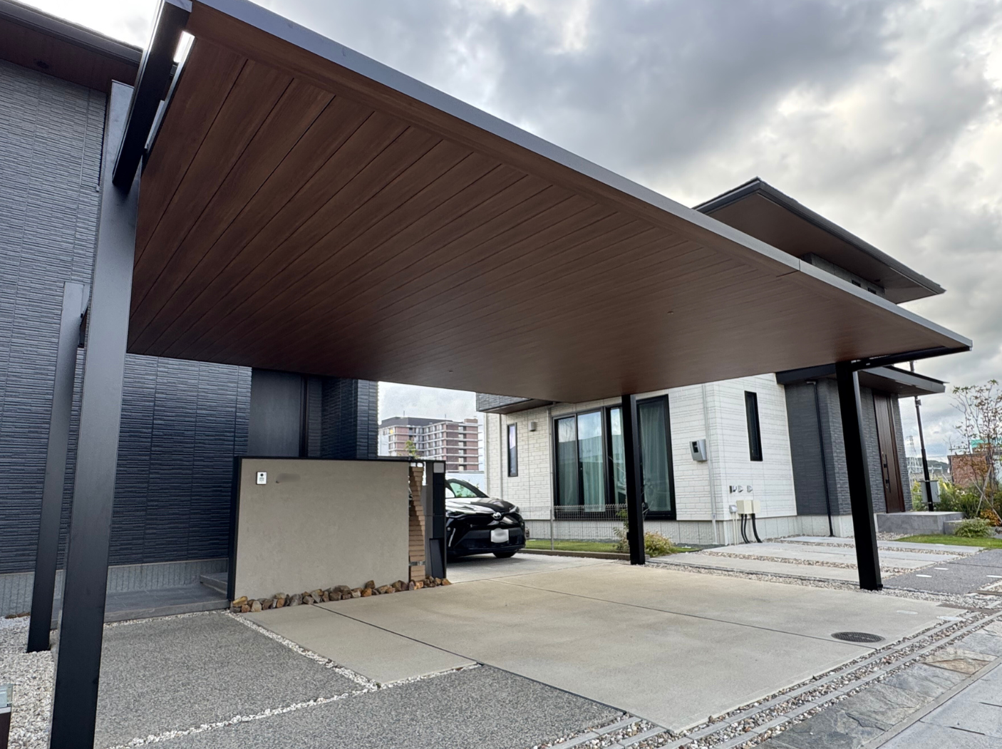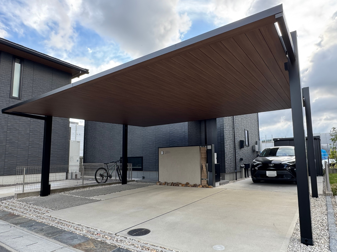 また、限られたスペースと台形の駐車スペース、一台用のカーポートがありました空間に大型のカーポートを設置しました。