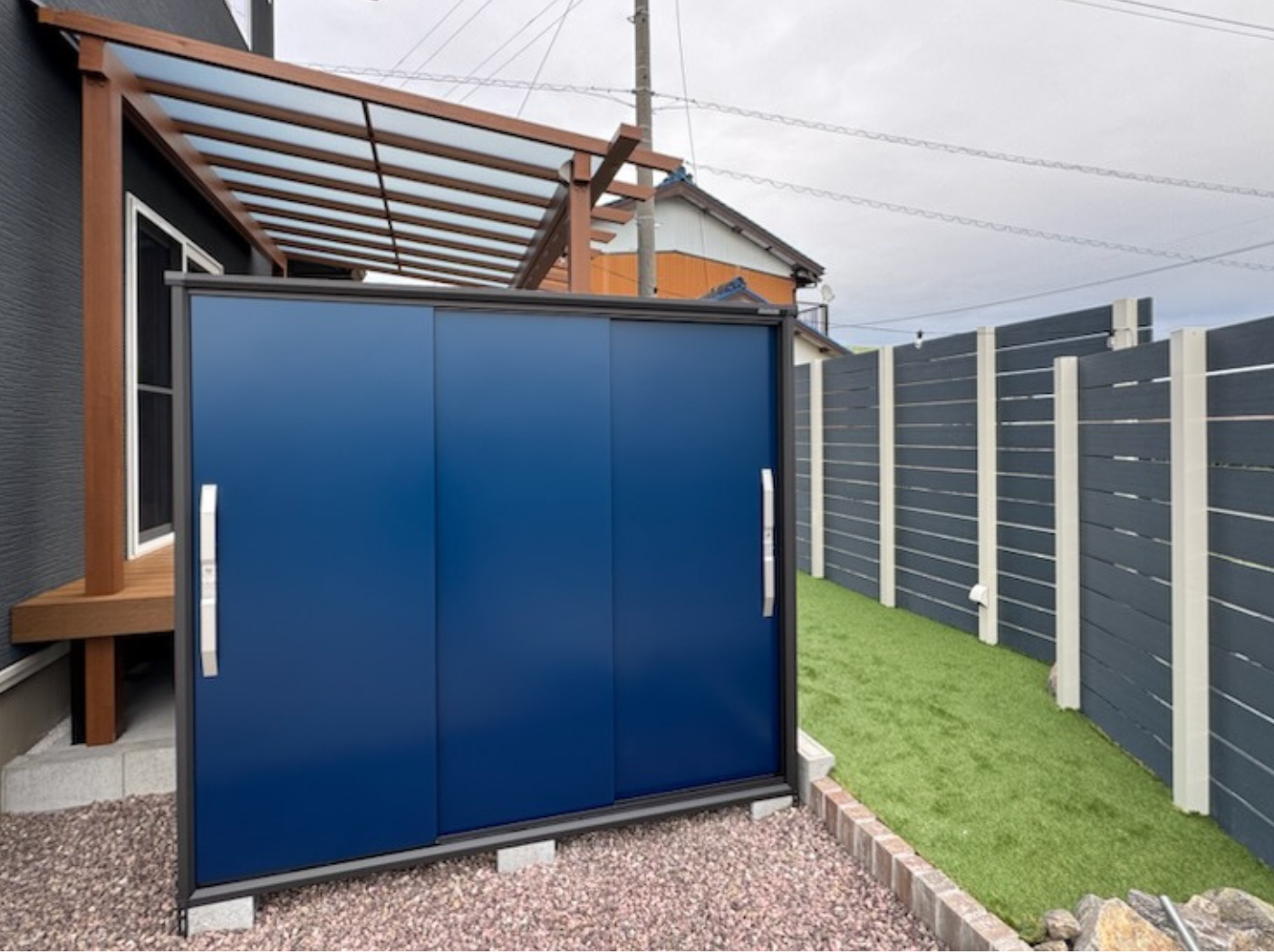 テラス屋根が物置の屋根手前まであるので、雨の日も気にせず物置の中の出し入れが可能です。