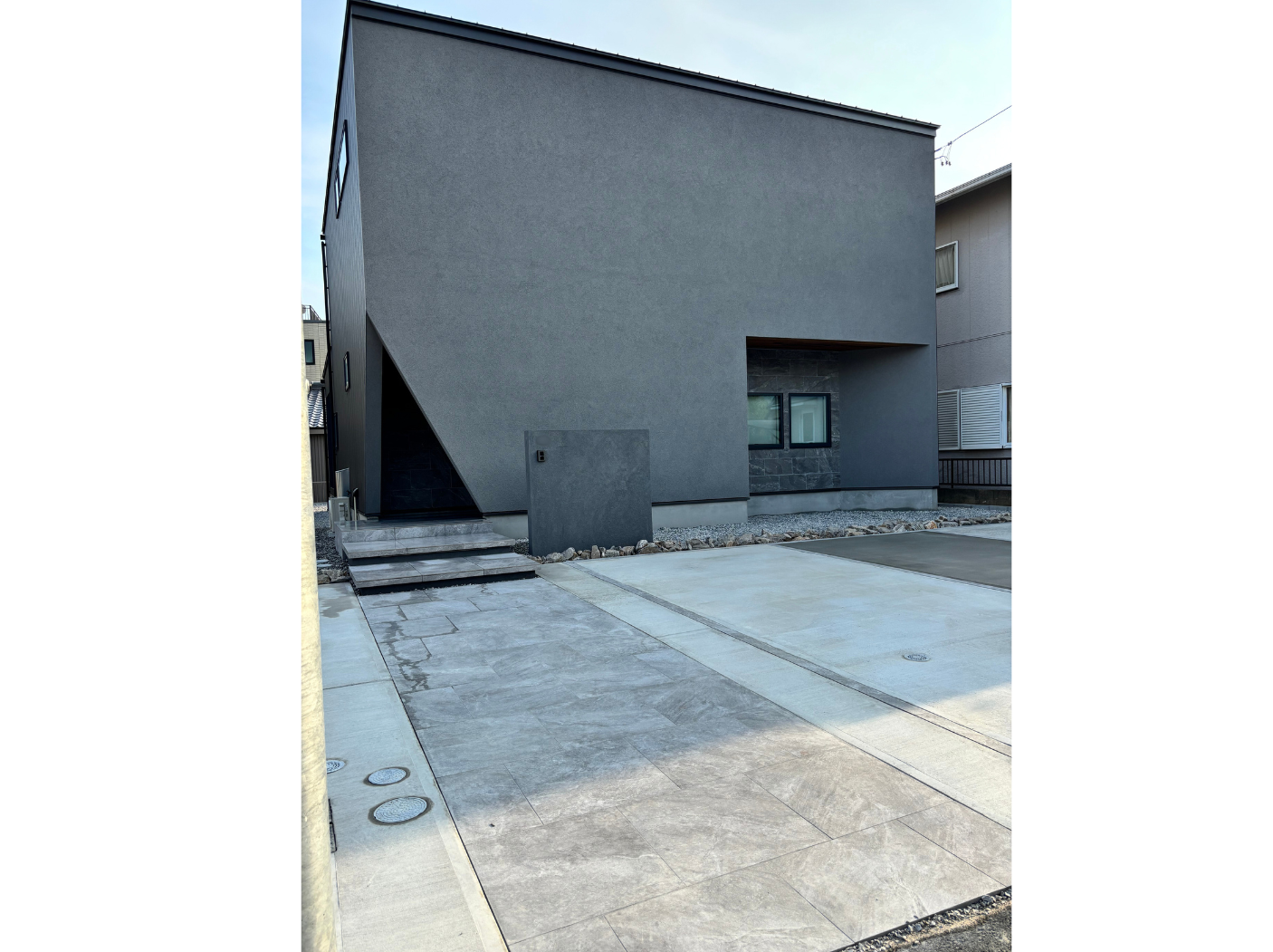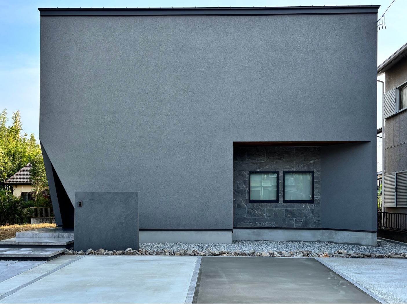 シンプルモダンな建物に調和するよう、外構もシンプルなデザインを施しました。
