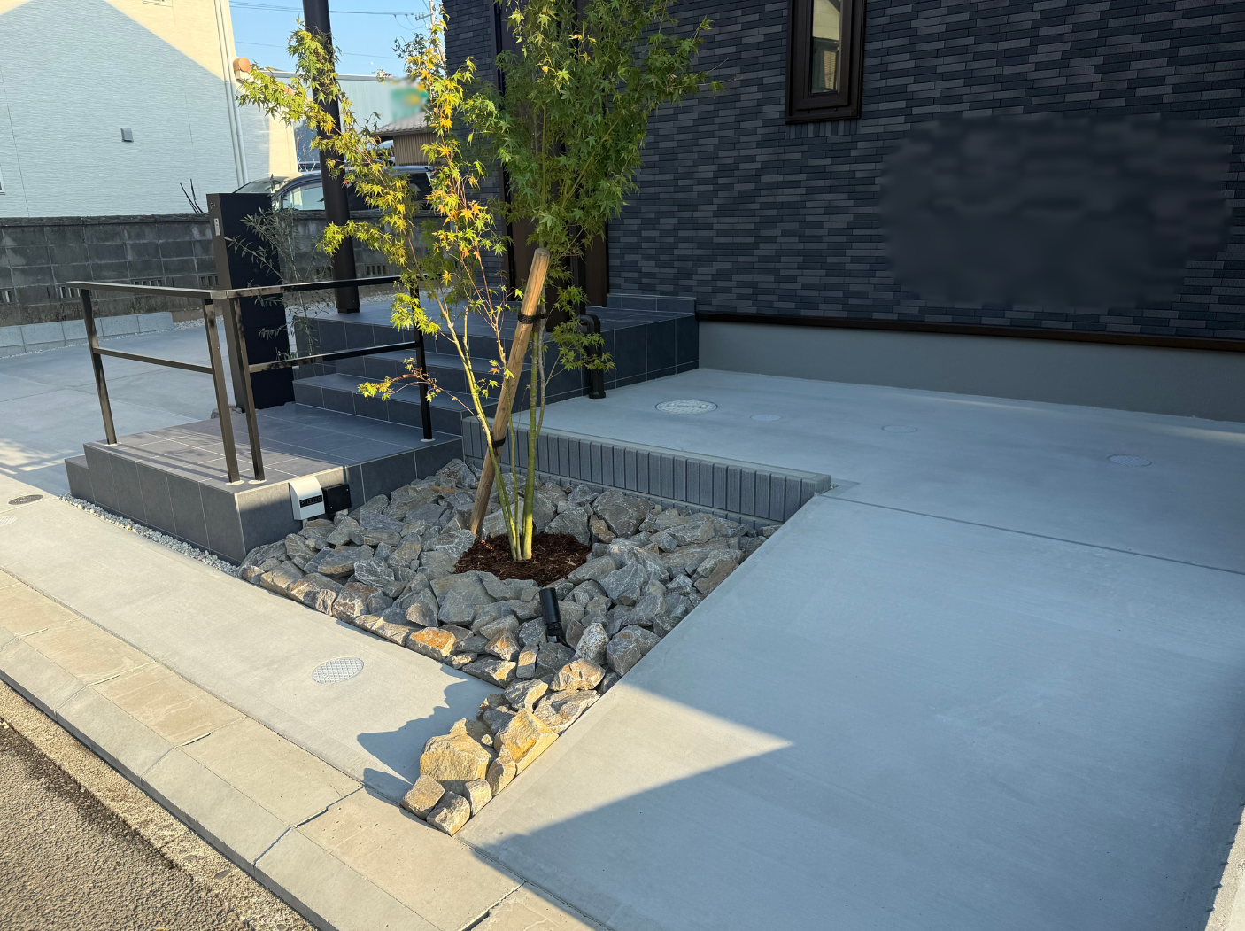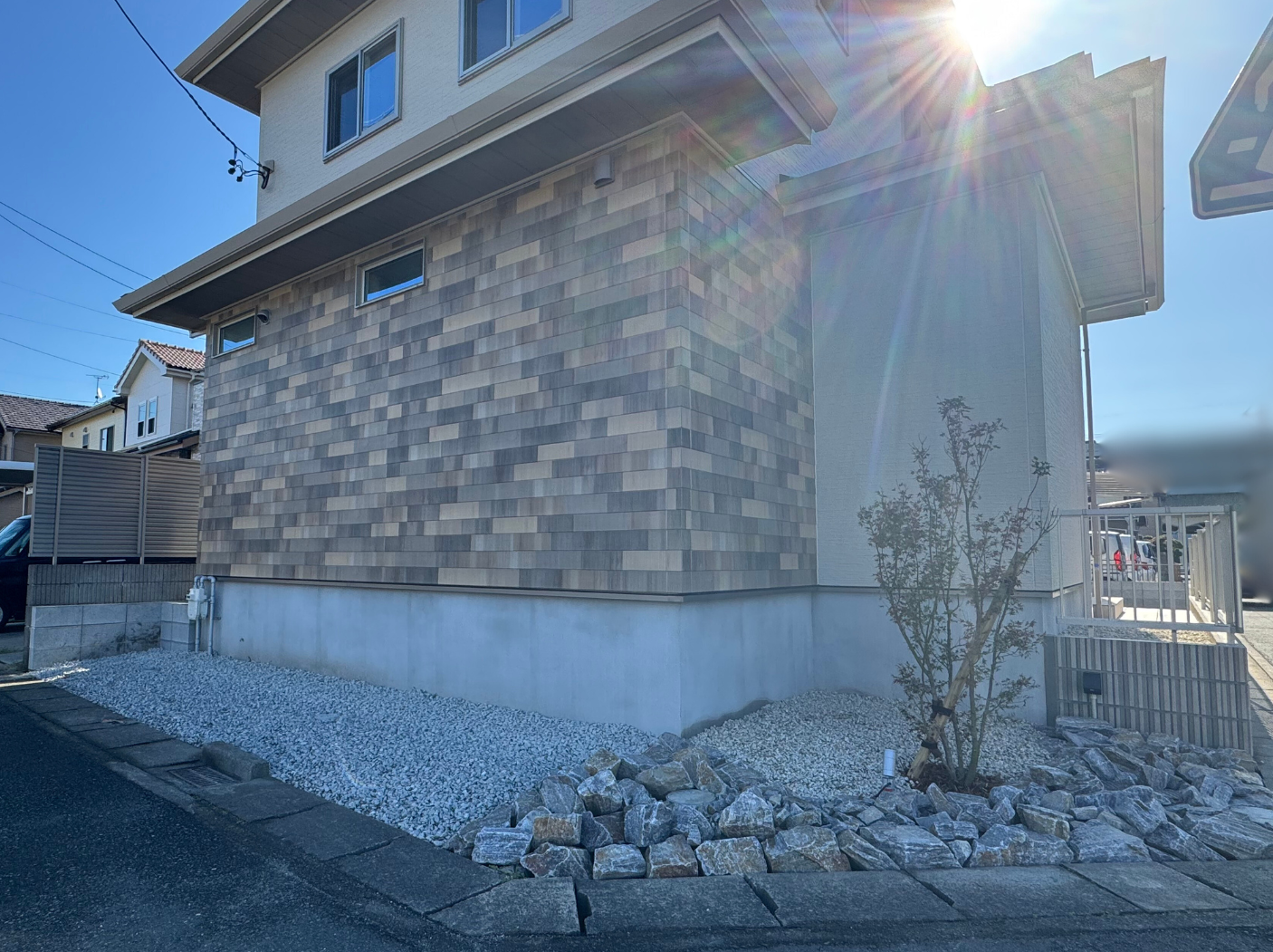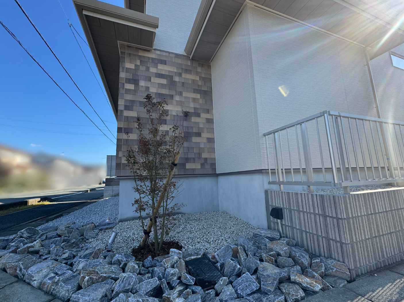 玄関まわりには植栽スペースを施し、栗石を並べる事によって落ち着きのある『ジャパニーズモダン』な仕上がりになりました。