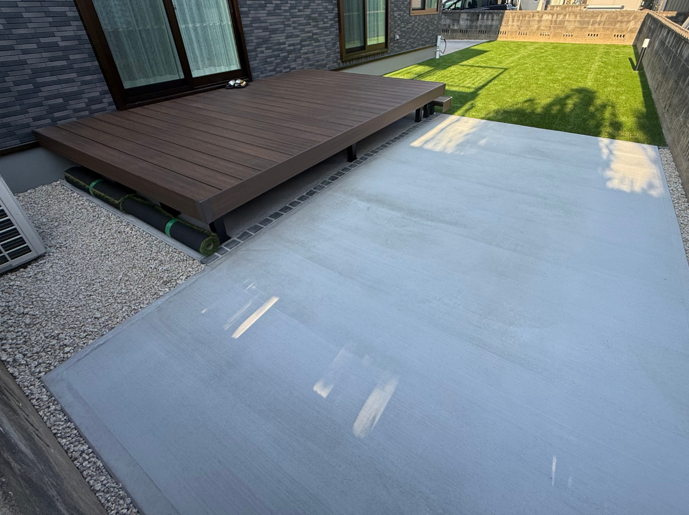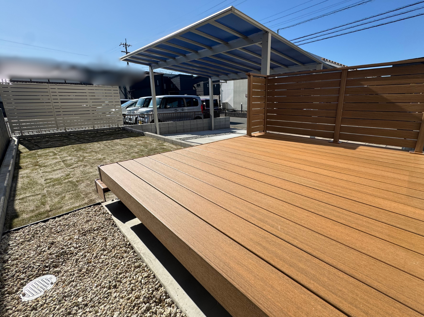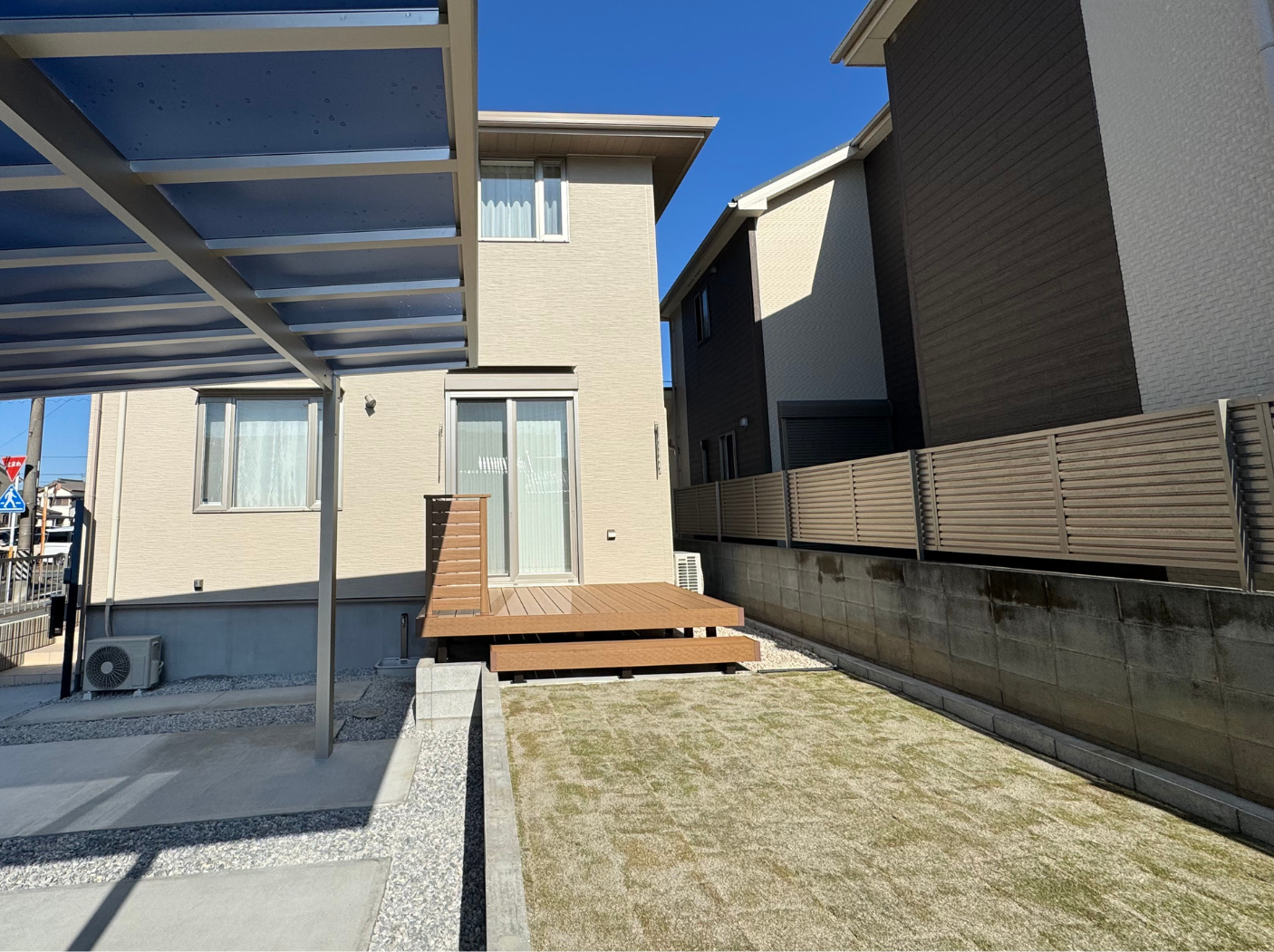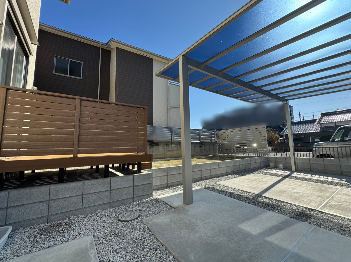 芝生のお庭と合わせて、お友達を招いてのバーベキューや家族団らんのスペースとして楽しめる空間ができあがりました。