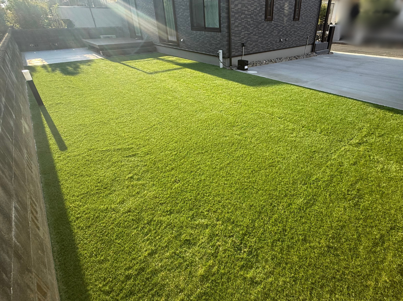 裸足でも気持ちよくお手入れも不要な人工芝のお庭は、グリーンの明るいイメージが