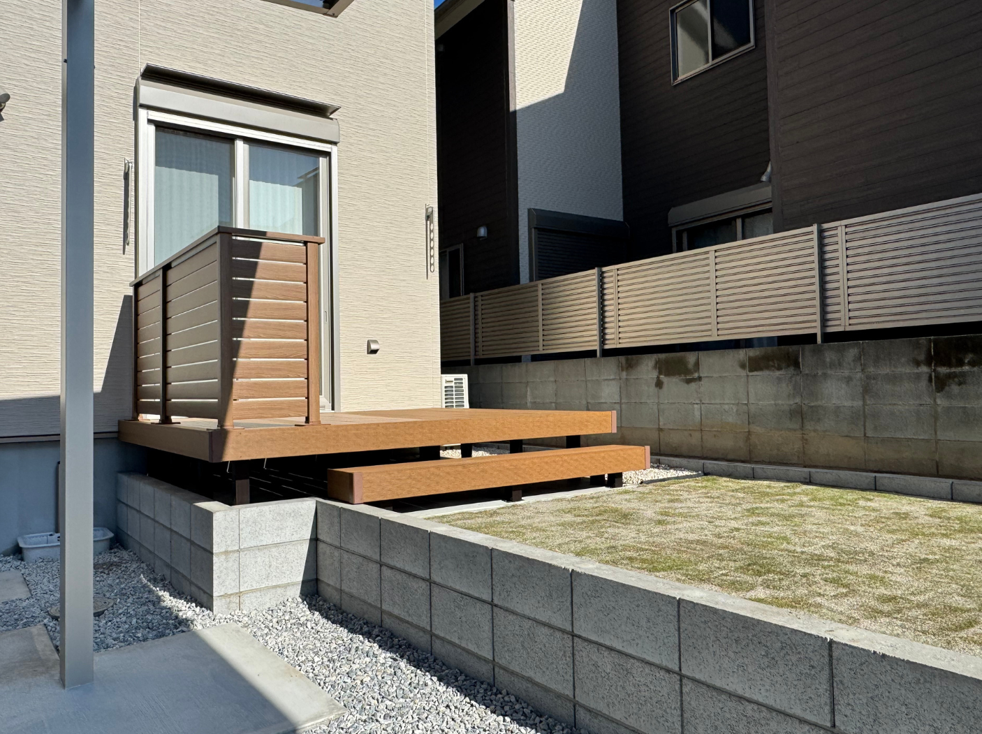 樹脂のウッドデッキを設置。ステップを付ける事でより快適に!