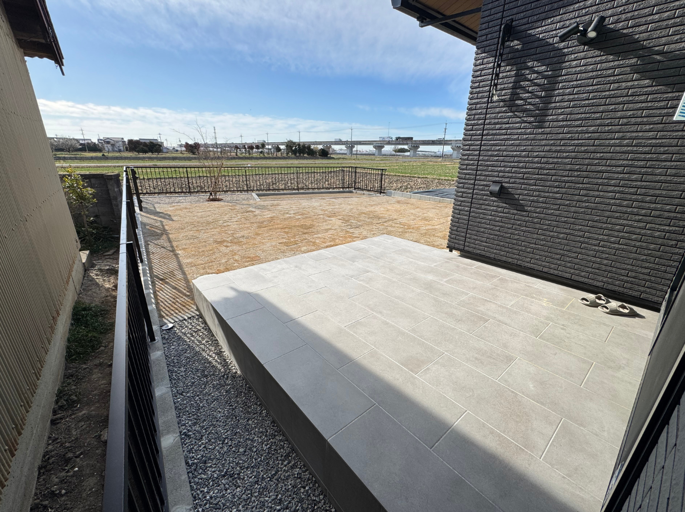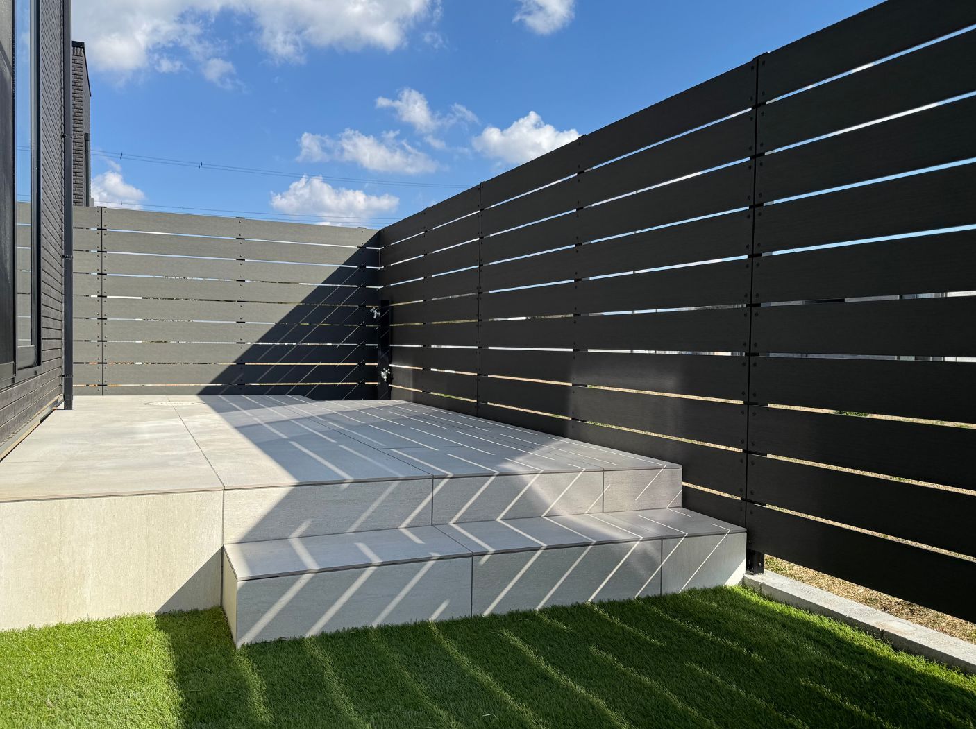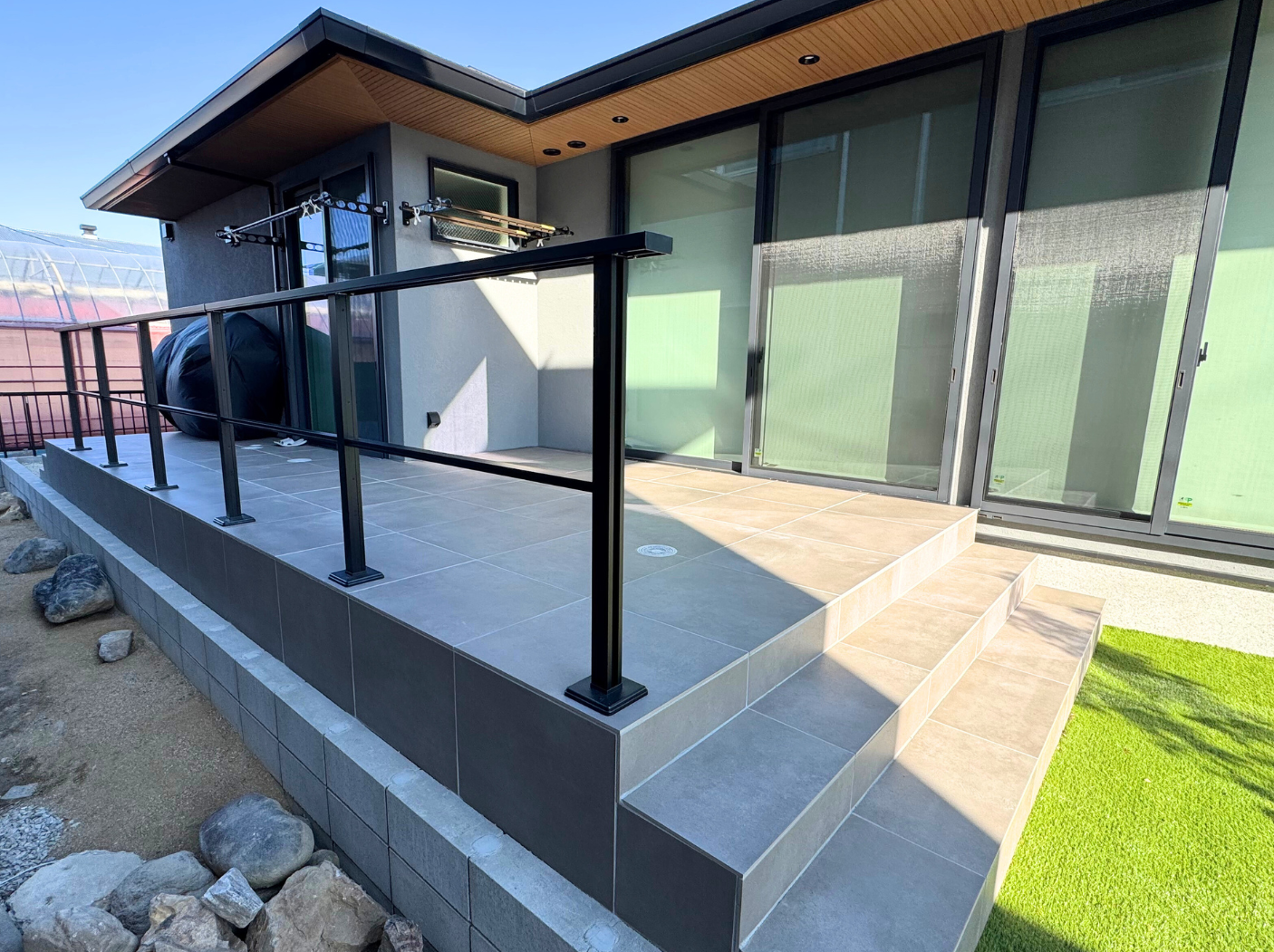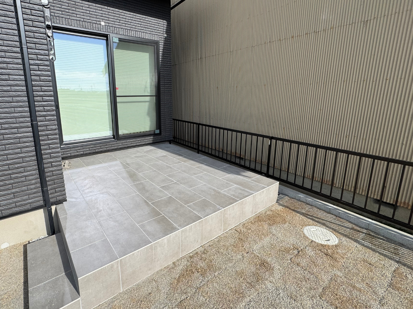 タイルデッキ:アイコットリョーワ ナバラD83 □600 手摺:LIXIL モダンデッキフェンス