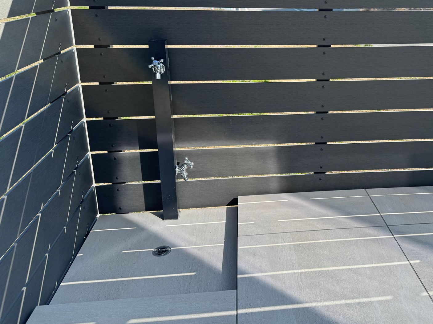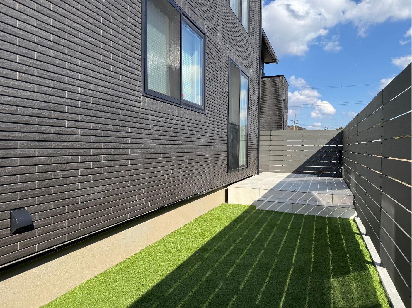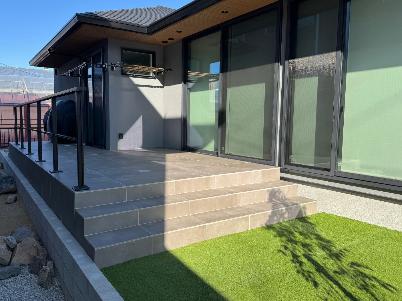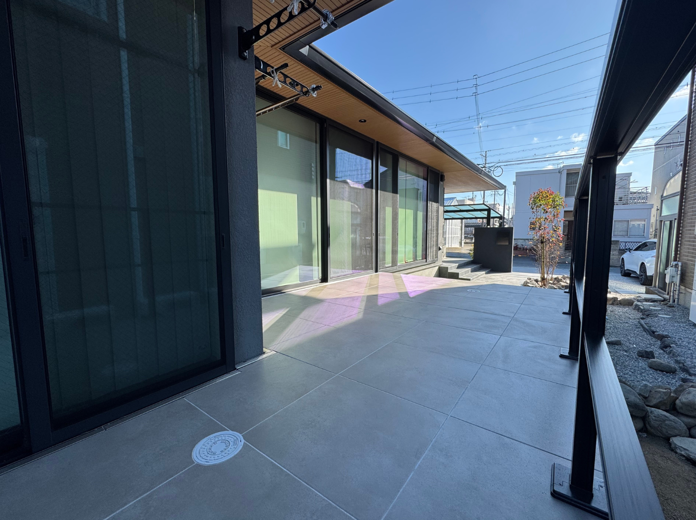 タイルデッキ:アイコットリョーワ ナバラD83 □600 手摺:LIXIL モダンデッキフェンス